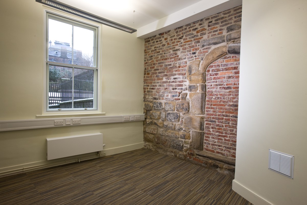 The project brief was to upgrade the internal space over four floors to meet current office standards, connect the building at ground floor level to Live Theatre Foyer, to restore the original south front doorway and to make the existing very private south courtyard more accessible.